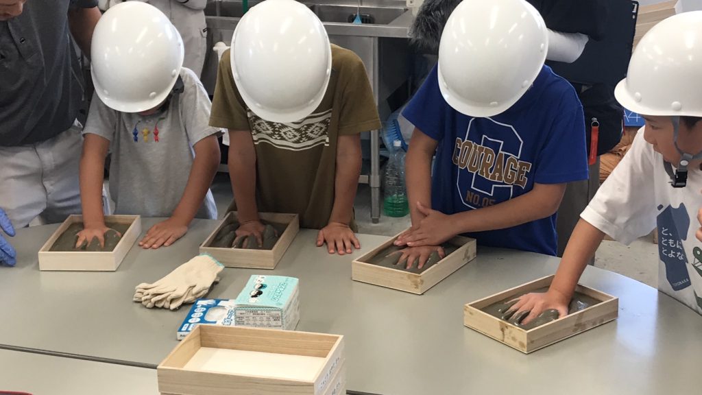 また目玉体験の【生コンクリートで自分の手形を作ってみよう!】ということで、