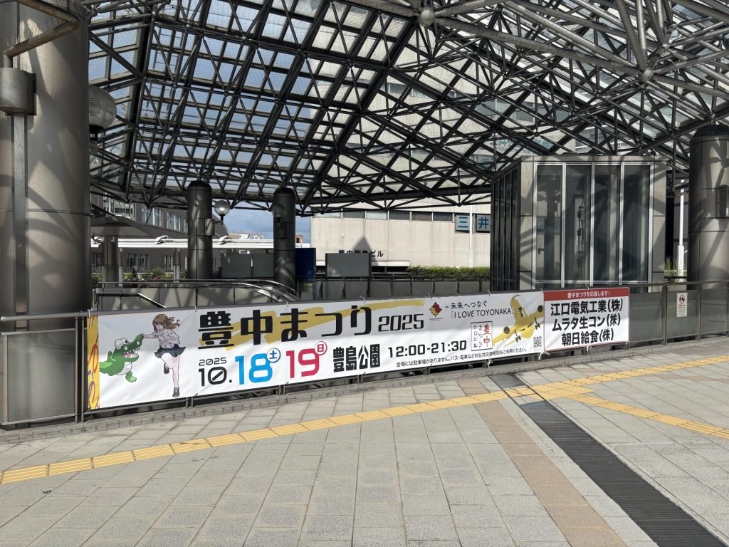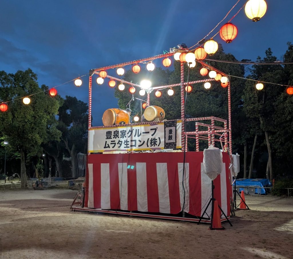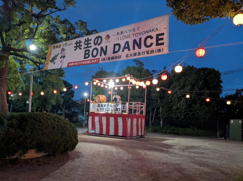 豊中駅前の歩道橋への横断幕と、盆踊りのやぐらへご協賛させていただきました。